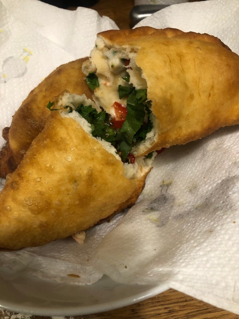 Wet all round the edge with water, then fold in half and with your fingers, press the dough edges together to get a tight seal. If the pituni are not properly sealed, the steam and liquid from the filling will react explosively with the hot oil.