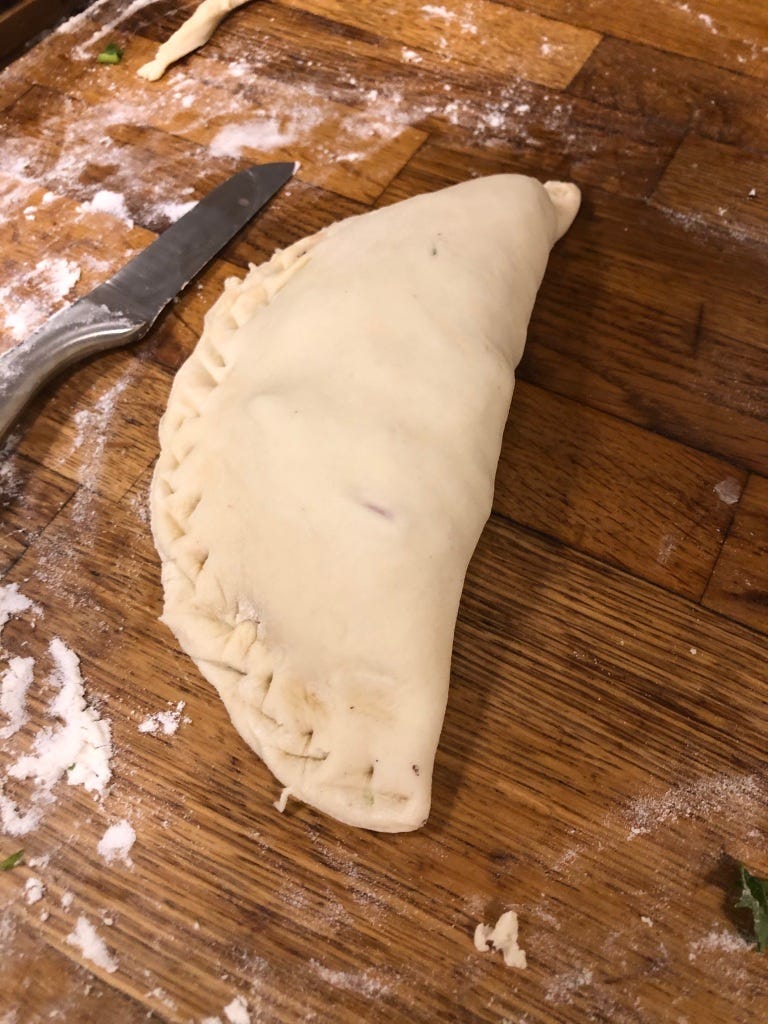 (You can use your own imagination here; Simeti suggests anchovies, scarole and Tuma or primo sale cheese, but also an onion and caper filling, which didn’t work for me).