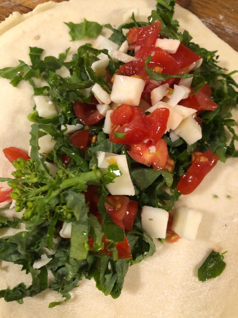 Take a side plate as a template and cut a disc out of your rolled dough, placing a mix of the cheese, tomatoes and greens on one half (leaving a gap around the edge to allow you to seal the pituni.
